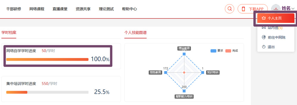 选课后自学不少于50学时,点击:右上角姓名处→个人主页,网络自学学时进度达到100%(注:学时进度更新会延迟1天),即可结业。